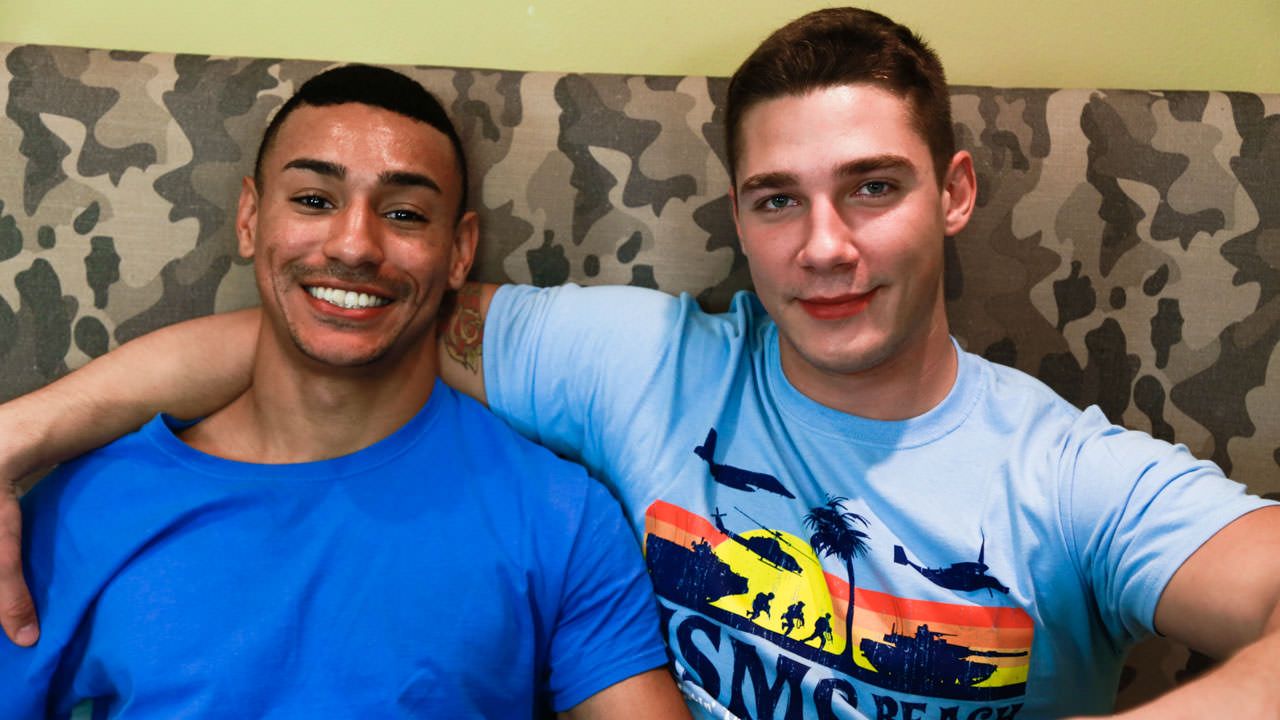 Spencer Laval arrived first so he sat down with Dirk for a small conversation before Zion Nicholas arrived. Spencer is excited to be fucked by Zion's big dick. Zion comes walking into the room and Dirk has them get into action right away. Zion is a little nervous but Spencer isn't so he takes his clothtes off and soon enough he has Zion's big hard cock deep in his mouth. Spencer gags on every inch of his dick and can't help but compliment him on how sexy his throbbing cock is. Zion wants to try sucking some cock so he begins to suck on Spencers and he uses lots of spit which he gags all over. Zion loves the dick in his mouth but all of a sudden he flips Spencer's legs up in the air and spreads his ass and buries his face in his hole. Spencer's ass is ready to be fucked and he tells Zion its time to bend him over. Zion does just that and pushes his hard raw cock into Spencer's super tight hole. Once his hole is spread from the girth of Zion he starts fucking him hard and deep all over the bed. Zion uses his big dick perfectly and makes Spencer blow his load all over himself and soon enough Zion pulls his cock out and strokes all over his nut all over Spencer.