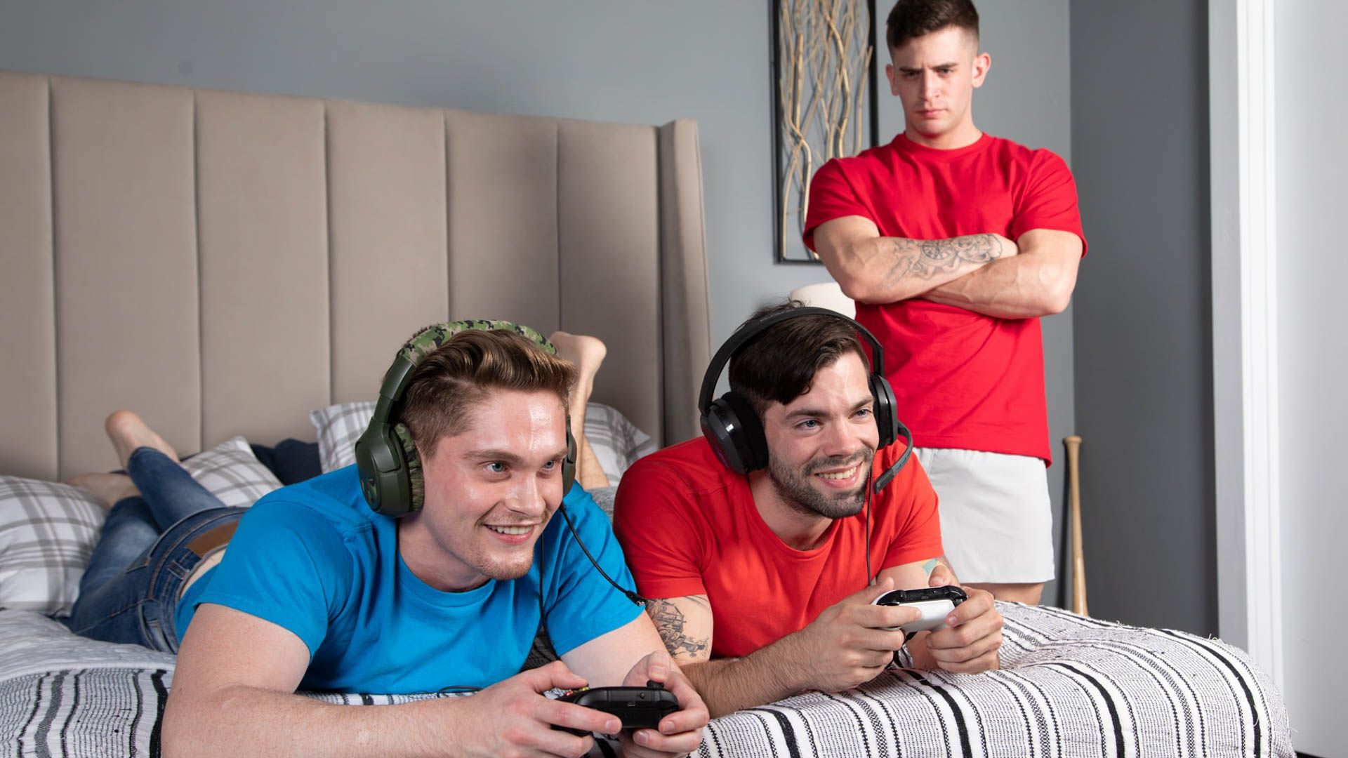 Julian is surprised, admitting that he's had some of those feelings too, but didn't think he could act on it. But Trevor convinces him that they CAN. Julian and Trevor kiss, and eventually start playing with each other's asses. Jay then returns with snacks, and is shocked to see what's happening. Julian tells Jay and Trevor that he likes BOTH of them, and everyone agrees to try sharing. Jay gets behind Julian and Trevor as he gropes their asses. Meanwhile, Julian and Trevor continue kissing, and even playing the video game for a bit. But eventually, Julian and Trevor put down the video game controllers so they can put their full attention into the sexy threesome!